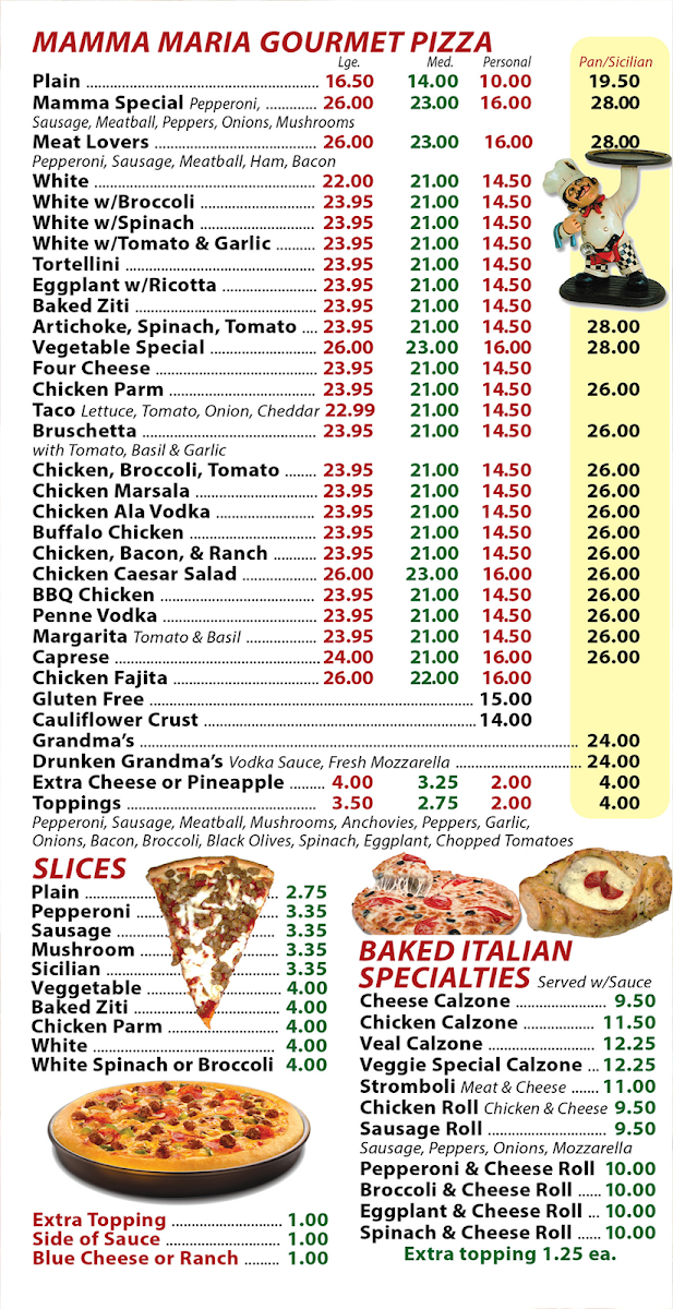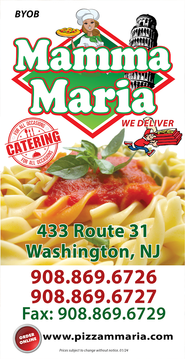 When you walk into Mamma Maria Pizza in Washington Twp, NJ, you’re in for a treat that feels just like home. The Mamma Maria Pizza Menu offers a variety of mouth-watering options, perfect for any pizza lover or anyone craving something a little different. Whether you’re in the mood for a classic Margherita pizza, a deliciously cheesy slice of four-cheese heaven, or something with a little more flair like their pepperoni or sausage pizza, there’s no shortage of choices. If you're not feeling pizza, they also serve a range of hearty pastas, fresh salads, and tempting appetizers that pair beautifully with their variety of beverages. The flavors are rich, the ingredients fresh, and every dish prepared with care. For a cozy meal that hits the spot every time, this menu is exactly what you need! Whether you're grabbing a quick bite or enjoying a meal with friends and family, there's something for everyone here at Mamma Maria’s.